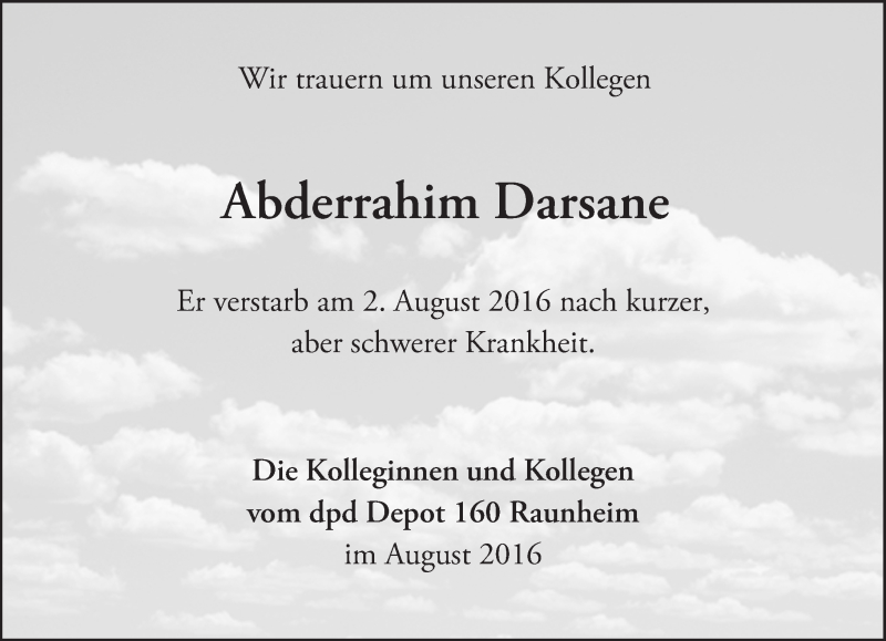 Hier finden Sie alle Traueranzeigen aus der Zeitung, die bisher für Abderrahim Darsane erschienen sind. Weitere Traueranzeigen, die in der Zeitung erscheinen, werden hier ebenfalls aufgelistet