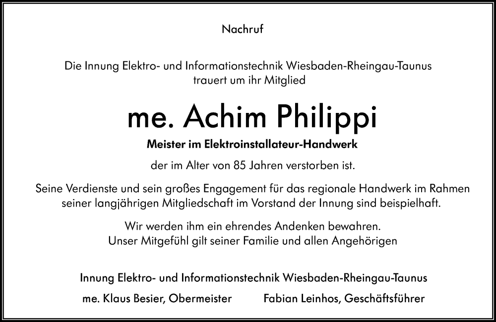 Hier finden Sie alle Traueranzeigen aus der Zeitung, die bisher für Achim Philippi erschienen sind. Weitere Traueranzeigen, die in der Zeitung erscheinen, werden hier ebenfalls aufgelistet