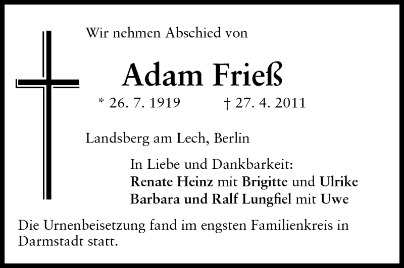 Hier finden Sie alle Traueranzeigen aus der Zeitung, die bisher für Adam Frieß erschienen sind. Weitere Traueranzeigen, die in der Zeitung erscheinen, werden hier ebenfalls aufgelistet