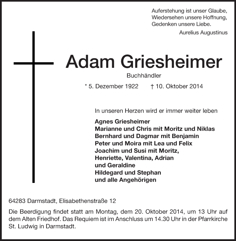 Hier finden Sie alle Traueranzeigen aus der Zeitung, die bisher für Adam Griesheimer erschienen sind. Weitere Traueranzeigen, die in der Zeitung erscheinen, werden hier ebenfalls aufgelistet