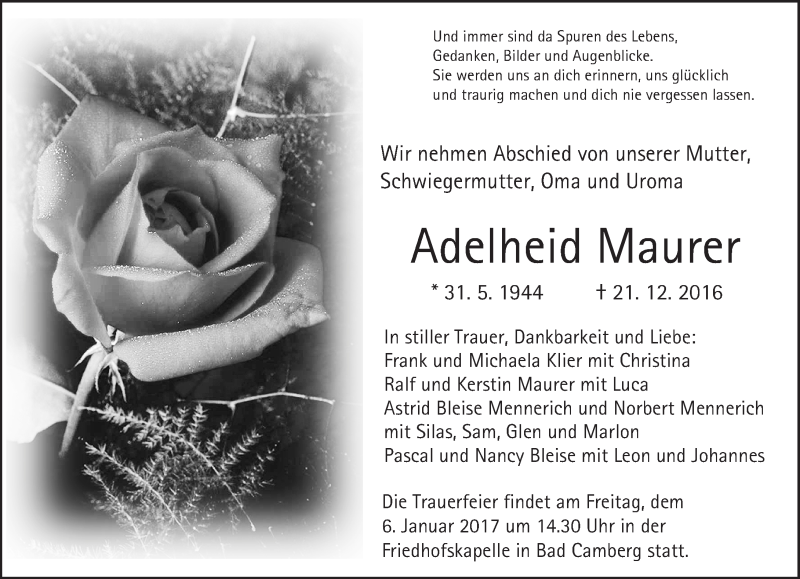 Hier finden Sie alle Traueranzeigen aus der Zeitung, die bisher für Adelheid Maurer erschienen sind. Weitere Traueranzeigen, die in der Zeitung erscheinen, werden hier ebenfalls aufgelistet