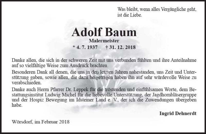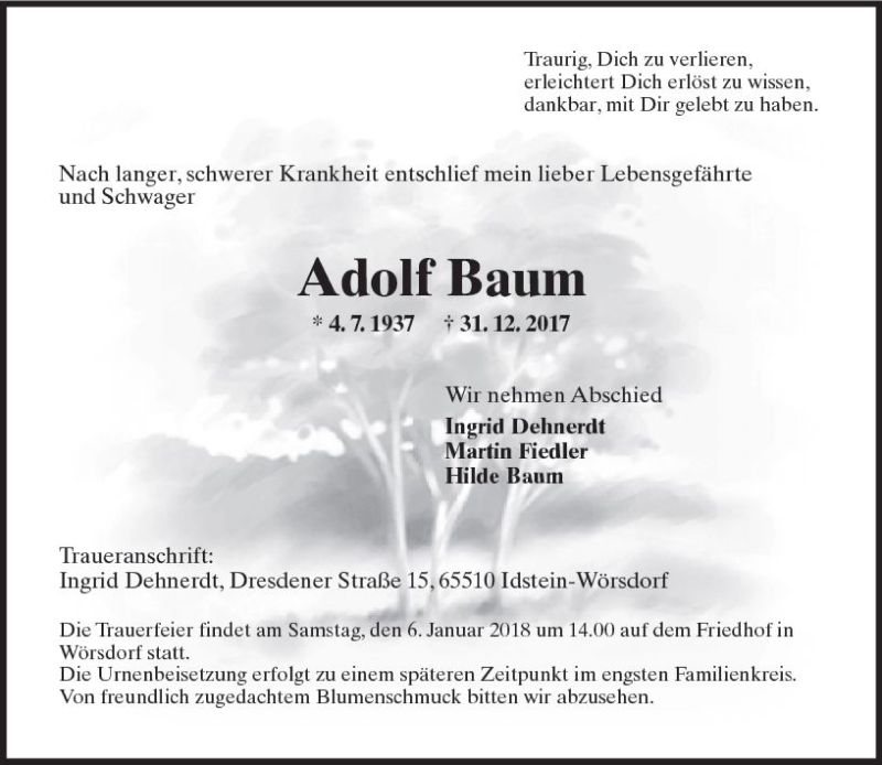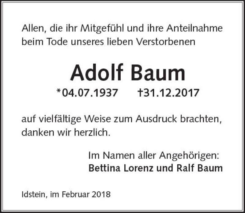 Hier finden Sie alle Traueranzeigen aus der Zeitung, die bisher für Adolf Baum erschienen sind. Weitere Traueranzeigen, die in der Zeitung erscheinen, werden hier ebenfalls aufgelistet