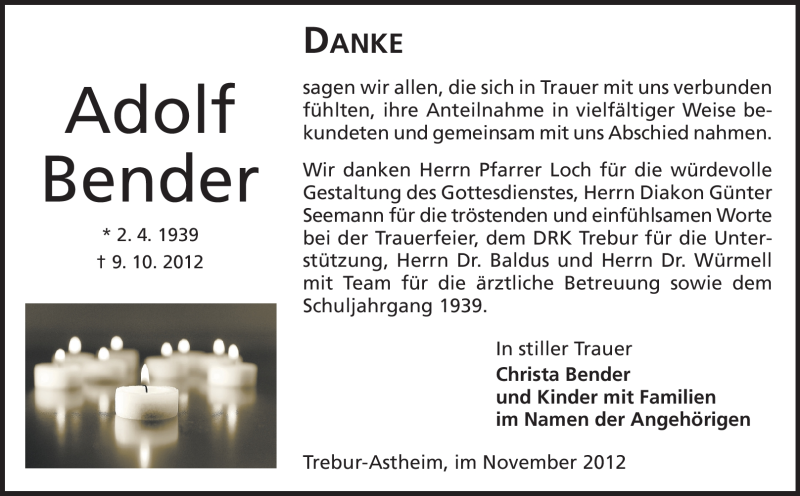 Hier finden Sie alle Traueranzeigen aus der Zeitung, die bisher für Adolf Bender erschienen sind. Weitere Traueranzeigen, die in der Zeitung erscheinen, werden hier ebenfalls aufgelistet