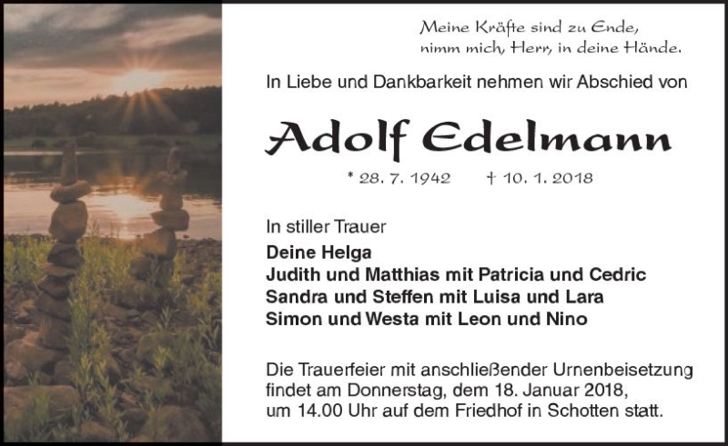 Hier finden Sie alle Traueranzeigen aus der Zeitung, die bisher für Adolf Edelmann erschienen sind. Weitere Traueranzeigen, die in der Zeitung erscheinen, werden hier ebenfalls aufgelistet
