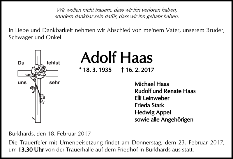 Hier finden Sie alle Traueranzeigen aus der Zeitung, die bisher für Adolf Haas erschienen sind. Weitere Traueranzeigen, die in der Zeitung erscheinen, werden hier ebenfalls aufgelistet