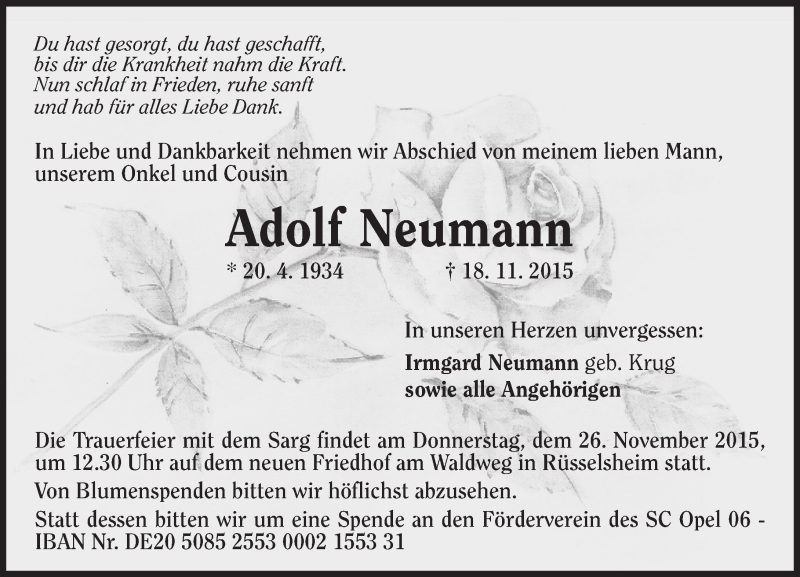 Hier finden Sie alle Traueranzeigen aus der Zeitung, die bisher für Adolf Neumann erschienen sind. Weitere Traueranzeigen, die in der Zeitung erscheinen, werden hier ebenfalls aufgelistet