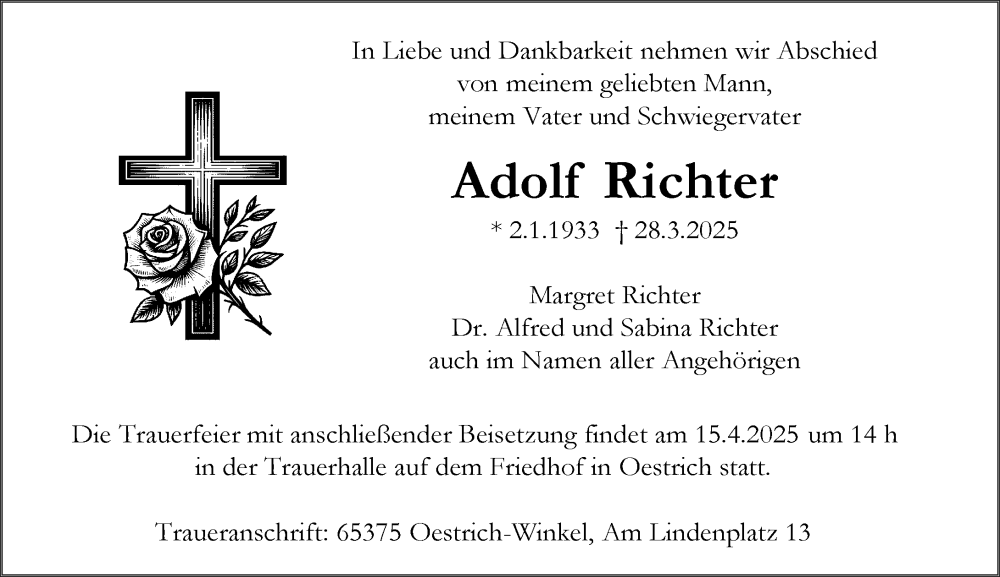Hier finden Sie alle Traueranzeigen aus der Zeitung, die bisher für Adolf Richter erschienen sind. Weitere Traueranzeigen, die in der Zeitung erscheinen, werden hier ebenfalls aufgelistet