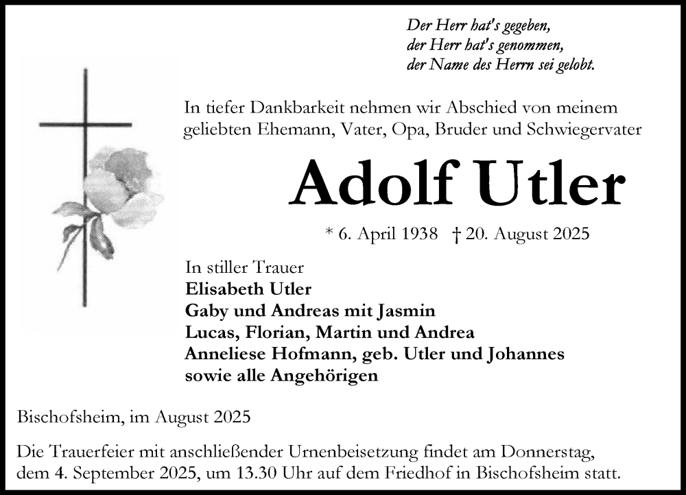 Hier finden Sie alle Traueranzeigen aus der Zeitung, die bisher für Adolf Utler erschienen sind. Weitere Traueranzeigen, die in der Zeitung erscheinen, werden hier ebenfalls aufgelistet