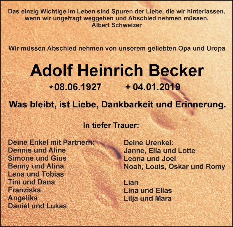 Hier finden Sie alle Traueranzeigen aus der Zeitung, die bisher für Adolf Heinrich Becker erschienen sind. Weitere Traueranzeigen, die in der Zeitung erscheinen, werden hier ebenfalls aufgelistet