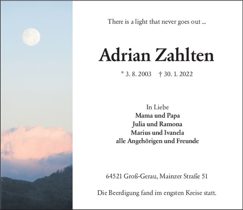 Hier finden Sie alle Traueranzeigen aus der Zeitung, die bisher für Adrian Zahlten erschienen sind. Weitere Traueranzeigen, die in der Zeitung erscheinen, werden hier ebenfalls aufgelistet