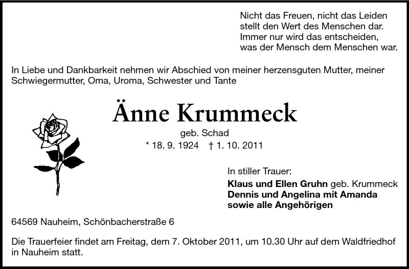 Hier finden Sie alle Traueranzeigen aus der Zeitung, die bisher für Änne Krummeck erschienen sind. Weitere Traueranzeigen, die in der Zeitung erscheinen, werden hier ebenfalls aufgelistet