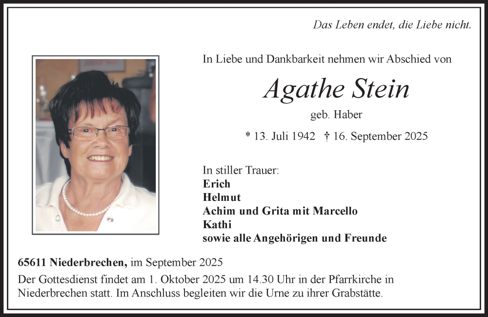 Hier finden Sie alle Traueranzeigen aus der Zeitung, die bisher für Agathe Stein erschienen sind. Weitere Traueranzeigen, die in der Zeitung erscheinen, werden hier ebenfalls aufgelistet