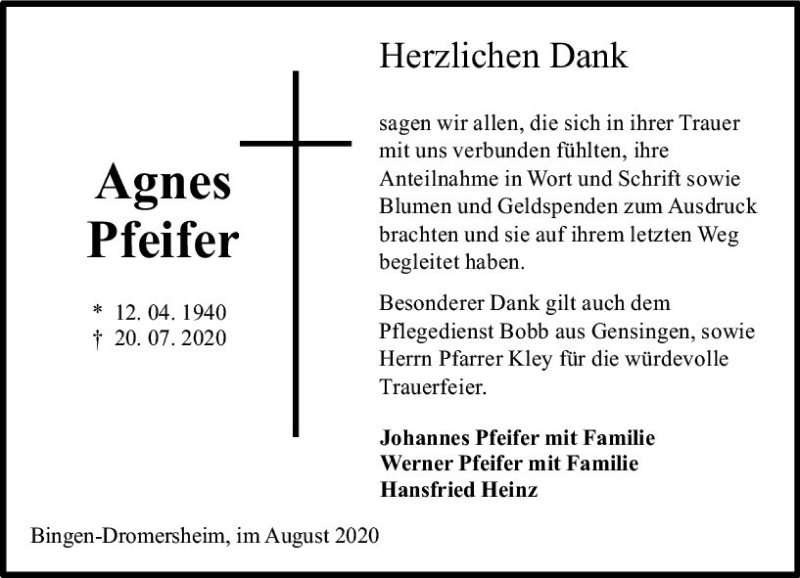 Hier finden Sie alle Traueranzeigen aus der Zeitung, die bisher für Agnes Pfeiffer erschienen sind. Weitere Traueranzeigen, die in der Zeitung erscheinen, werden hier ebenfalls aufgelistet