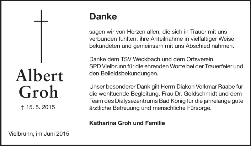Hier finden Sie alle Traueranzeigen aus der Zeitung, die bisher für Albert Groh erschienen sind. Weitere Traueranzeigen, die in der Zeitung erscheinen, werden hier ebenfalls aufgelistet