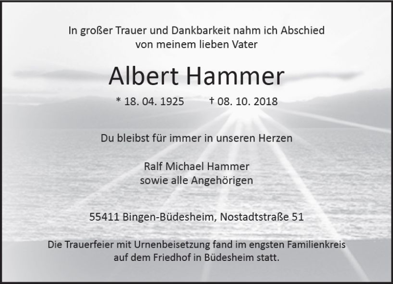 Hier finden Sie alle Traueranzeigen aus der Zeitung, die bisher für Albert Hammer erschienen sind. Weitere Traueranzeigen, die in der Zeitung erscheinen, werden hier ebenfalls aufgelistet