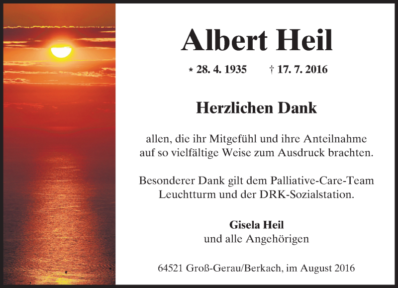 Hier finden Sie alle Traueranzeigen aus der Zeitung, die bisher für Albert Heil erschienen sind. Weitere Traueranzeigen, die in der Zeitung erscheinen, werden hier ebenfalls aufgelistet
