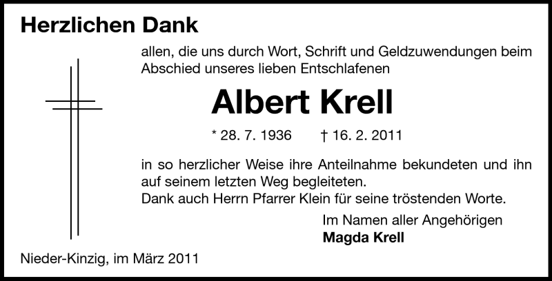 Hier finden Sie alle Traueranzeigen aus der Zeitung, die bisher für Albert Krell erschienen sind. Weitere Traueranzeigen, die in der Zeitung erscheinen, werden hier ebenfalls aufgelistet