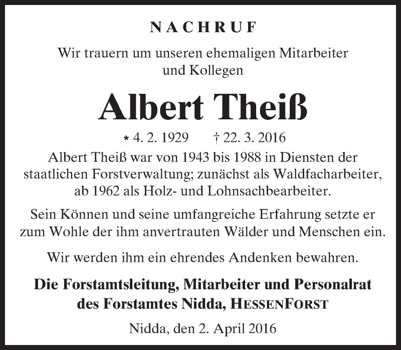 Hier finden Sie alle Traueranzeigen aus der Zeitung, die bisher für Albert Theiß erschienen sind. Weitere Traueranzeigen, die in der Zeitung erscheinen, werden hier ebenfalls aufgelistet