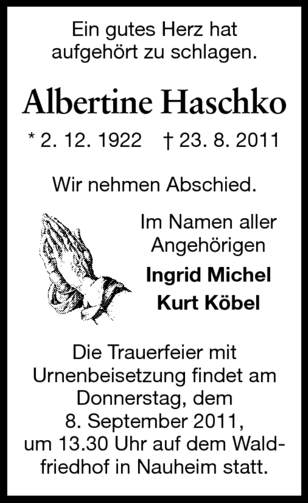 Hier finden Sie alle Traueranzeigen aus der Zeitung, die bisher für Albertine Haschko erschienen sind. Weitere Traueranzeigen, die in der Zeitung erscheinen, werden hier ebenfalls aufgelistet