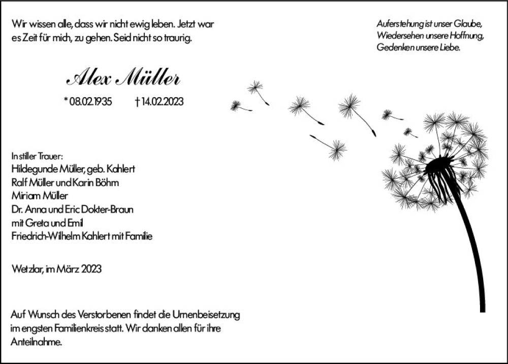 Hier finden Sie alle Traueranzeigen aus der Zeitung, die bisher für Alex Müller erschienen sind. Weitere Traueranzeigen, die in der Zeitung erscheinen, werden hier ebenfalls aufgelistet