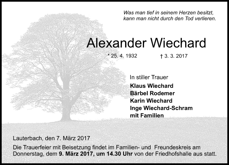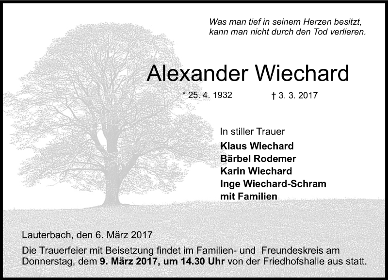Hier finden Sie alle Traueranzeigen aus der Zeitung, die bisher für Alexander Wiechard erschienen sind. Weitere Traueranzeigen, die in der Zeitung erscheinen, werden hier ebenfalls aufgelistet