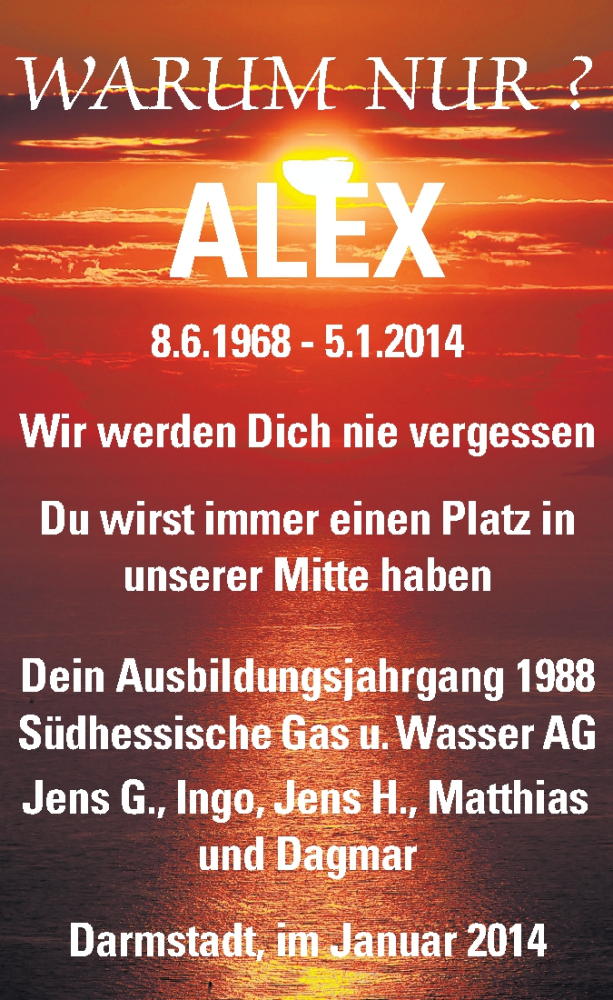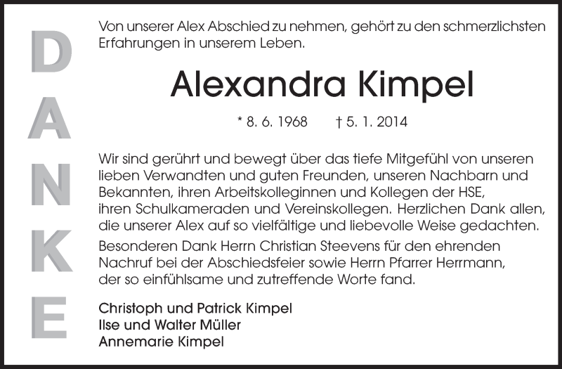 Hier finden Sie alle Traueranzeigen aus der Zeitung, die bisher für Alexandra Kimpel erschienen sind. Weitere Traueranzeigen, die in der Zeitung erscheinen, werden hier ebenfalls aufgelistet