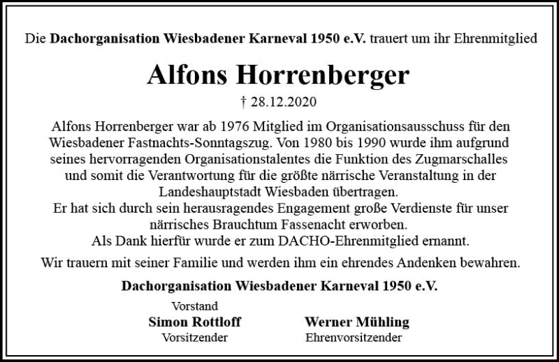 Hier finden Sie alle Traueranzeigen aus der Zeitung, die bisher für Alfons Horrenberger erschienen sind. Weitere Traueranzeigen, die in der Zeitung erscheinen, werden hier ebenfalls aufgelistet