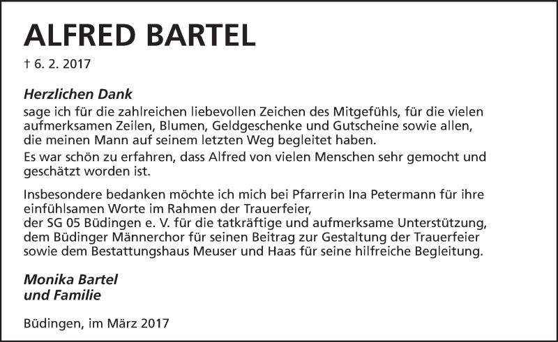 Hier finden Sie alle Traueranzeigen aus der Zeitung, die bisher für Alfred Bartel erschienen sind. Weitere Traueranzeigen, die in der Zeitung erscheinen, werden hier ebenfalls aufgelistet