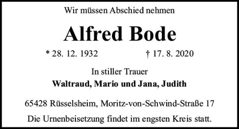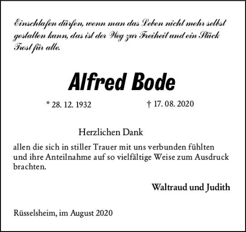 Hier finden Sie alle Traueranzeigen aus der Zeitung, die bisher für Alfred Bode erschienen sind. Weitere Traueranzeigen, die in der Zeitung erscheinen, werden hier ebenfalls aufgelistet