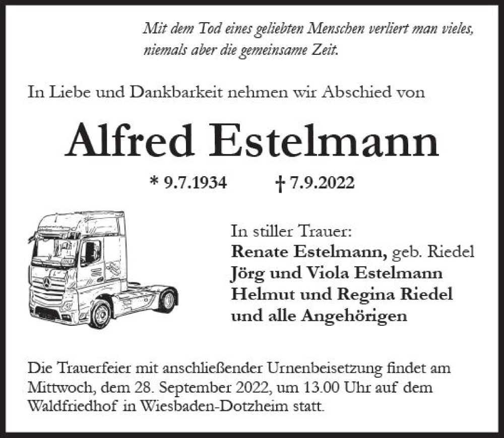 Hier finden Sie alle Traueranzeigen aus der Zeitung, die bisher für Alfred Estelmann erschienen sind. Weitere Traueranzeigen, die in der Zeitung erscheinen, werden hier ebenfalls aufgelistet