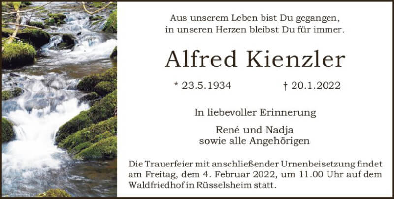 Hier finden Sie alle Traueranzeigen aus der Zeitung, die bisher für Alfred Kienzler erschienen sind. Weitere Traueranzeigen, die in der Zeitung erscheinen, werden hier ebenfalls aufgelistet