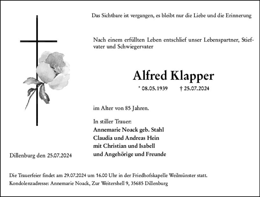 Hier finden Sie alle Traueranzeigen aus der Zeitung, die bisher für Alfred Klapper erschienen sind. Weitere Traueranzeigen, die in der Zeitung erscheinen, werden hier ebenfalls aufgelistet