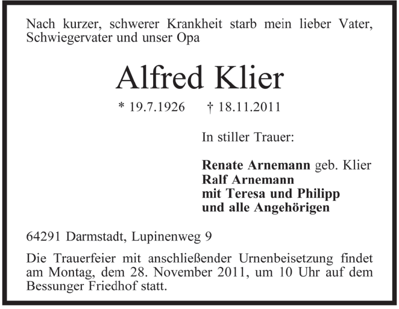 Hier finden Sie alle Traueranzeigen aus der Zeitung, die bisher für Alfred Klier erschienen sind. Weitere Traueranzeigen, die in der Zeitung erscheinen, werden hier ebenfalls aufgelistet