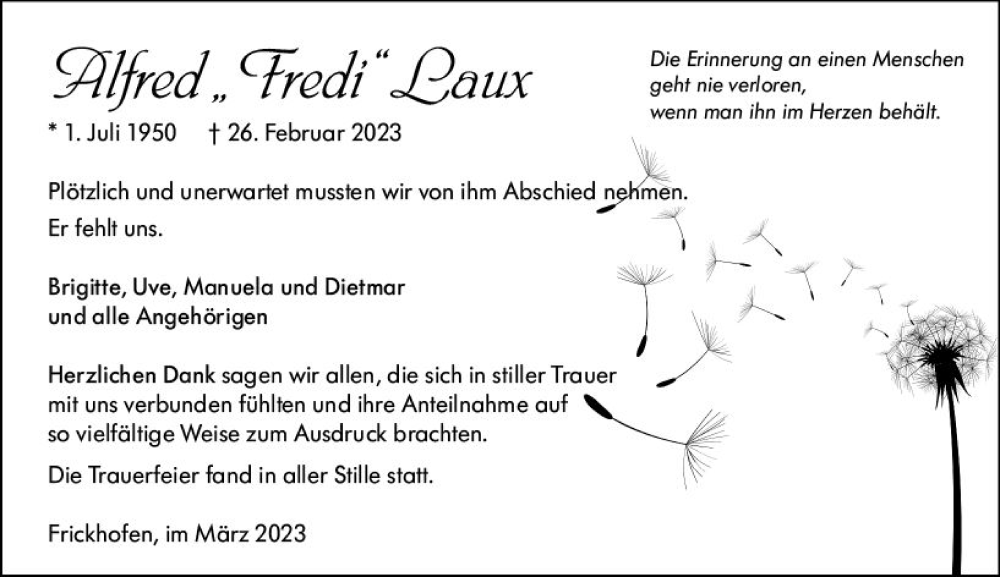 Hier finden Sie alle Traueranzeigen aus der Zeitung, die bisher für Alfred Laux erschienen sind. Weitere Traueranzeigen, die in der Zeitung erscheinen, werden hier ebenfalls aufgelistet