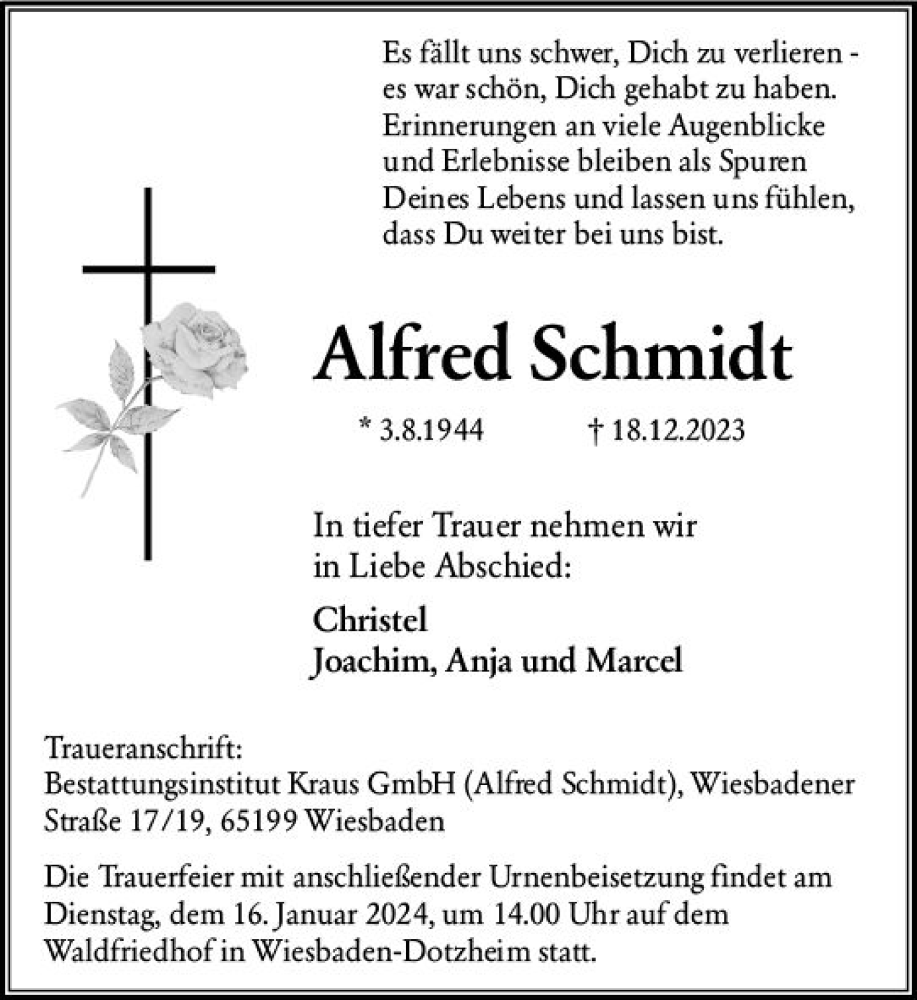 Hier finden Sie alle Traueranzeigen aus der Zeitung, die bisher für Alfred Schmidt erschienen sind. Weitere Traueranzeigen, die in der Zeitung erscheinen, werden hier ebenfalls aufgelistet