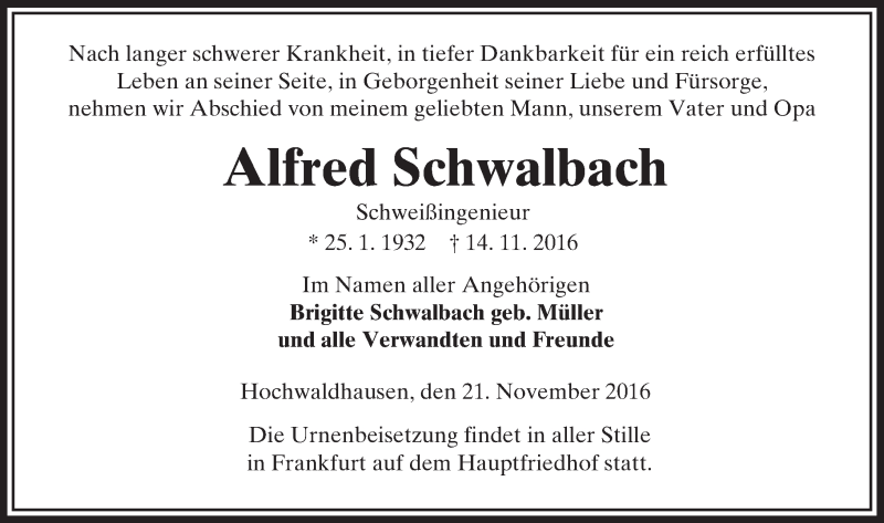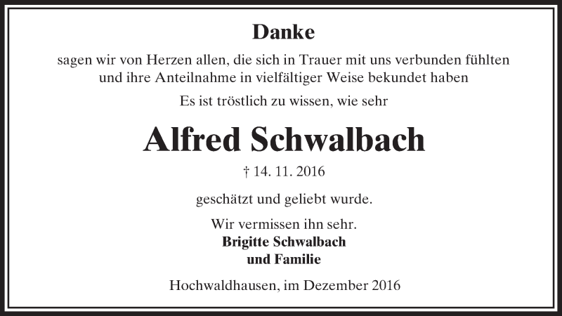 Hier finden Sie alle Traueranzeigen aus der Zeitung, die bisher für Alfred Schwalbach erschienen sind. Weitere Traueranzeigen, die in der Zeitung erscheinen, werden hier ebenfalls aufgelistet