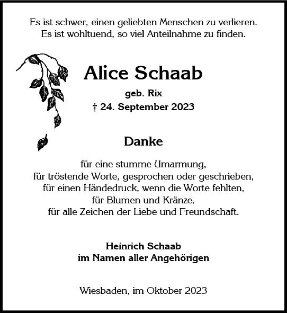 Hier finden Sie alle Traueranzeigen aus der Zeitung, die bisher für Alice Schaab erschienen sind. Weitere Traueranzeigen, die in der Zeitung erscheinen, werden hier ebenfalls aufgelistet
