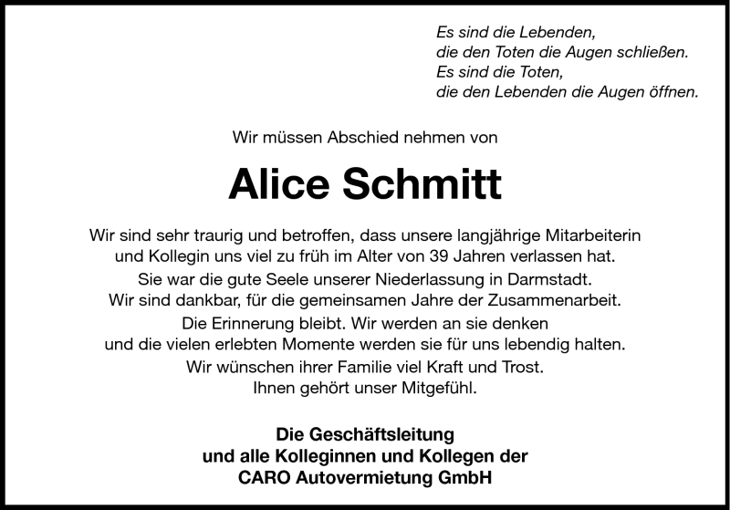 Hier finden Sie alle Traueranzeigen aus der Zeitung, die bisher für Alice Schmitt erschienen sind. Weitere Traueranzeigen, die in der Zeitung erscheinen, werden hier ebenfalls aufgelistet