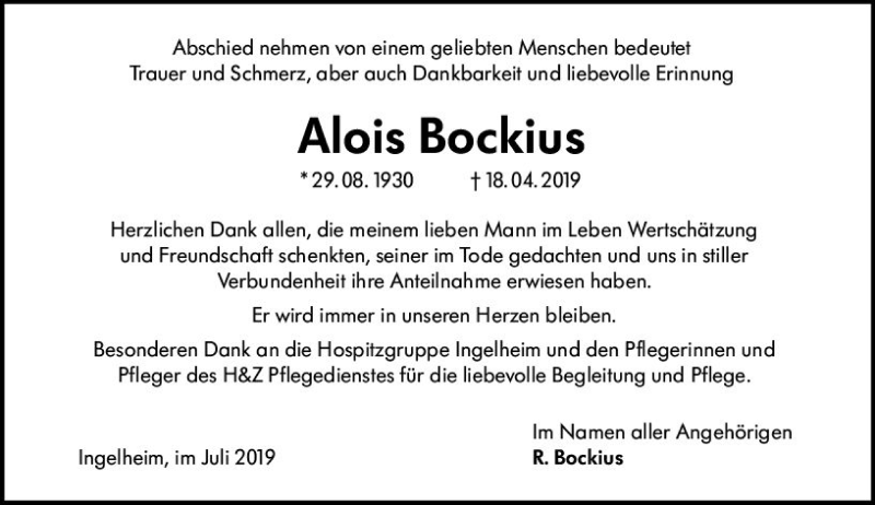 Hier finden Sie alle Traueranzeigen aus der Zeitung, die bisher für Alois Bockius erschienen sind. Weitere Traueranzeigen, die in der Zeitung erscheinen, werden hier ebenfalls aufgelistet