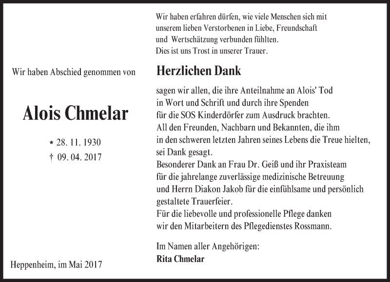 Hier finden Sie alle Traueranzeigen aus der Zeitung, die bisher für Alois Chmelar erschienen sind. Weitere Traueranzeigen, die in der Zeitung erscheinen, werden hier ebenfalls aufgelistet