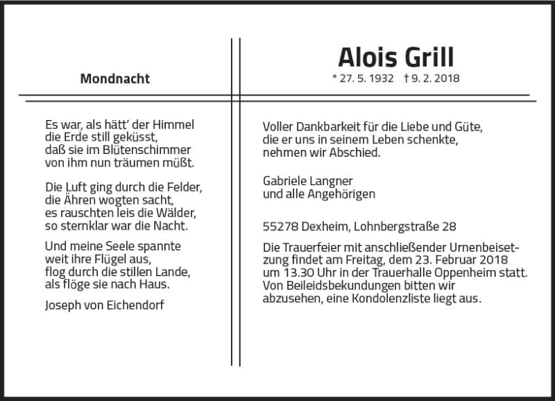 Hier finden Sie alle Traueranzeigen aus der Zeitung, die bisher für Alois Grill erschienen sind. Weitere Traueranzeigen, die in der Zeitung erscheinen, werden hier ebenfalls aufgelistet