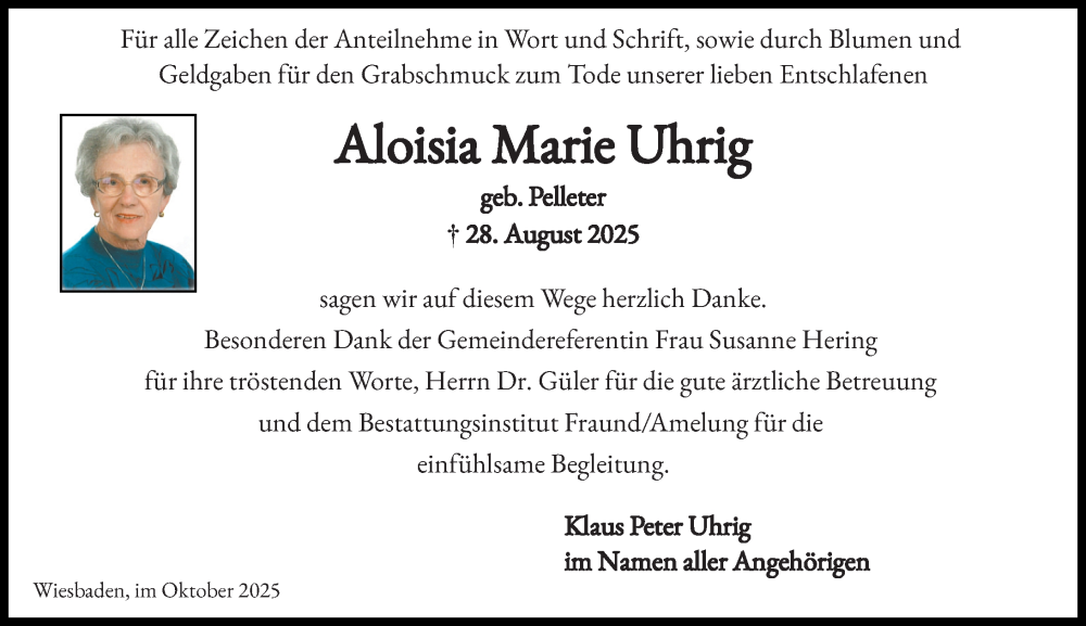 Hier finden Sie alle Traueranzeigen aus der Zeitung, die bisher für Aloisia Marie Uhrig erschienen sind. Weitere Traueranzeigen, die in der Zeitung erscheinen, werden hier ebenfalls aufgelistet