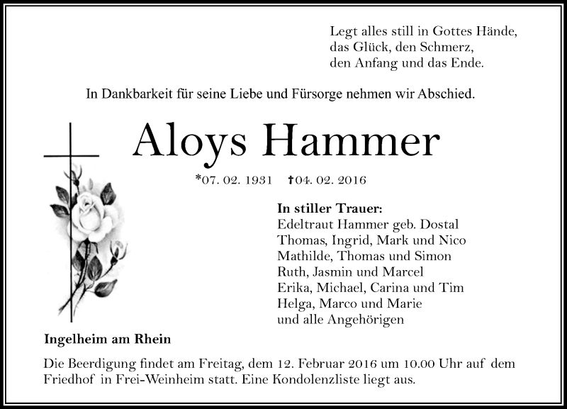 Hier finden Sie alle Traueranzeigen aus der Zeitung, die bisher für Aloys Hammer erschienen sind. Weitere Traueranzeigen, die in der Zeitung erscheinen, werden hier ebenfalls aufgelistet