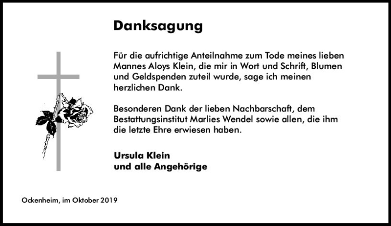 Hier finden Sie alle Traueranzeigen aus der Zeitung, die bisher für Aloys Klein erschienen sind. Weitere Traueranzeigen, die in der Zeitung erscheinen, werden hier ebenfalls aufgelistet
