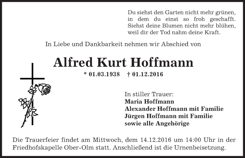 Hier finden Sie alle Traueranzeigen aus der Zeitung, die bisher für Alred Kurt Hoffmann erschienen sind. Weitere Traueranzeigen, die in der Zeitung erscheinen, werden hier ebenfalls aufgelistet