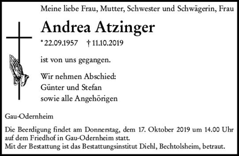 Hier finden Sie alle Traueranzeigen aus der Zeitung, die bisher für Andrea Atzinger erschienen sind. Weitere Traueranzeigen, die in der Zeitung erscheinen, werden hier ebenfalls aufgelistet