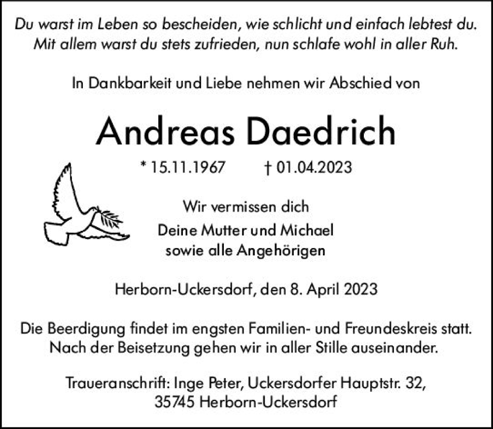 Hier finden Sie alle Traueranzeigen aus der Zeitung, die bisher für Andreas Daedrich erschienen sind. Weitere Traueranzeigen, die in der Zeitung erscheinen, werden hier ebenfalls aufgelistet