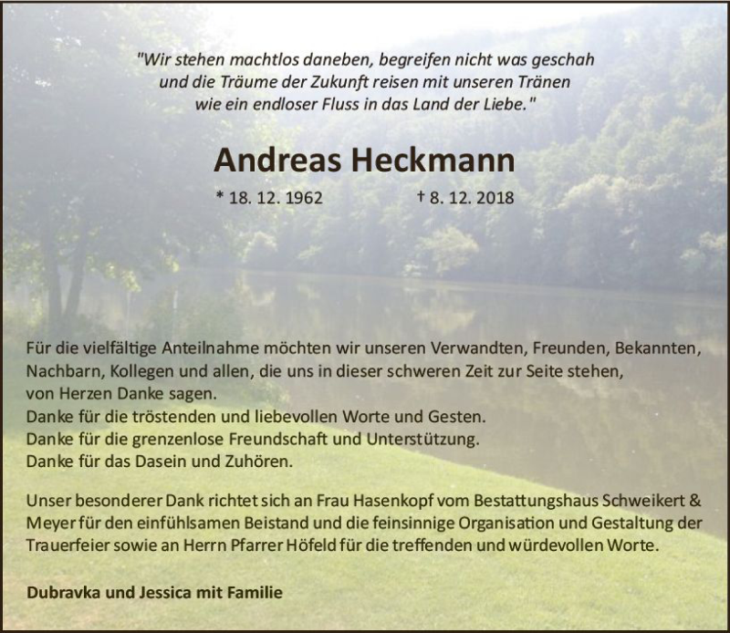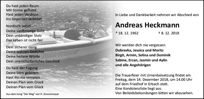 Hier finden Sie alle Traueranzeigen aus der Zeitung, die bisher für Andreas Heckmann erschienen sind. Weitere Traueranzeigen, die in der Zeitung erscheinen, werden hier ebenfalls aufgelistet