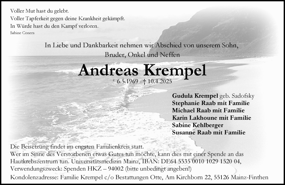 Hier finden Sie alle Traueranzeigen aus der Zeitung, die bisher für Andreas Krempel erschienen sind. Weitere Traueranzeigen, die in der Zeitung erscheinen, werden hier ebenfalls aufgelistet