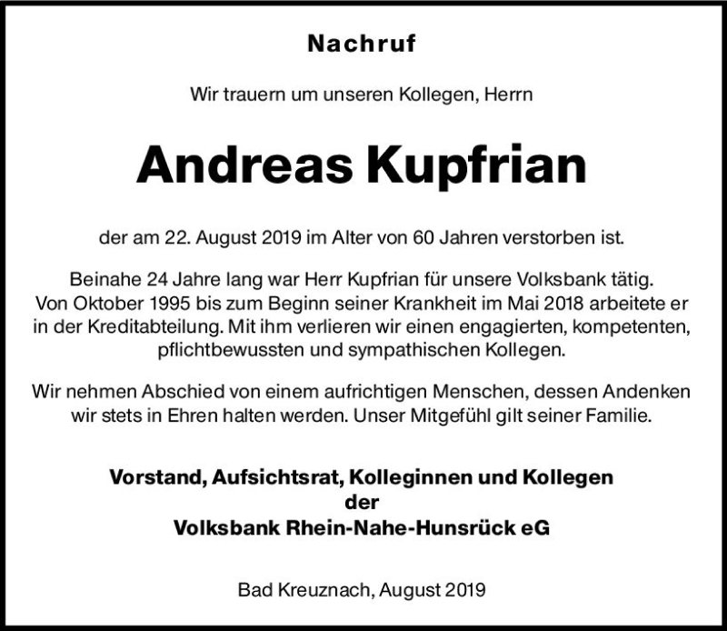 Hier finden Sie alle Traueranzeigen aus der Zeitung, die bisher für Andreas Kupfrian erschienen sind. Weitere Traueranzeigen, die in der Zeitung erscheinen, werden hier ebenfalls aufgelistet